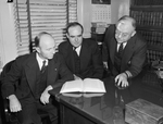 Left to right, Judge Atwood McDonald, J. Everett Cline and J. H. Brillhart. Image appeared in "They Guard Against 'Illegal' Adoptions," Star-Telegram Morning Edition, November 14, 1941. There are legal aspects to every child adoption case handled by Volunteers of America. Careful consideration is given to law questions while children are offered for adoption. Here are members of the legal staff, conferring.