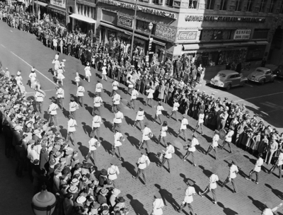 Armistice Day Parade in downtown Fort Worth, Texas. A long line of military men in parade formation with spectators watching. Spectators are still lined up along the street to watch. Published in Fort Worth Star-Telegram morning edition November 12, 1941.