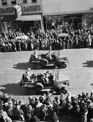 Armistice Day Parade in downtown Fort Worth, Texas. A long line of scout armored cars drive along a street as spectators watch. Published in Fort Worth Star-Telegram morning edition November 12, 1941.