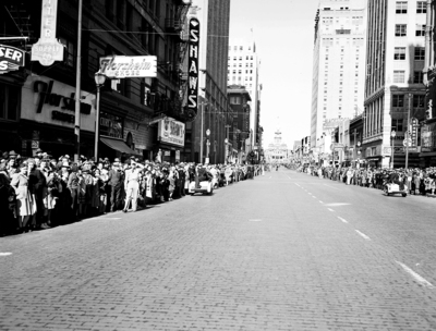 Armistice Day Parade in downtown Fort Worth, Texas. A long line of military men in parade formation with spectators watching. Spectators are still lined up along the street to watch. Published in Fort Worth Star-Telegram morning edition November 12, 1941.