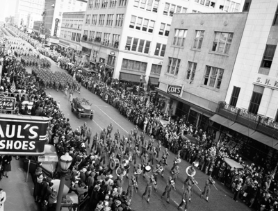 Armistice Day Parade in downtown Fort Worth, Texas. A long line of scout armored cars drive along a street as well as parade military men as spectators watch. Published in Fort Worth Star-Telegram morning edition November 12, 1941.