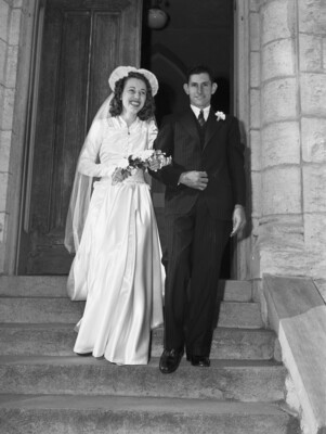 Wedding clothing & dress; George, Sam; George, Sam (Mrs.); Brides; Weddings; Flower arrangements; Grooms (Weddings)