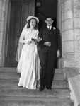 Mr. and Mrs. Sam George in wedding attire on stone steps with a stone and wood door in the background. Bride is wearing a white wedding gown and veil, holding a bouquet of flowers made of stephanotis. Groom is wearing a pin-striped suit with vest, light colored shirt, striped tie and light colored carnation boutonniere on his left breast pocket. Published Nov. 16, 1941 in the Star-Telegram morning edition.