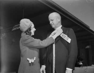 The Southwestern Exhibition and Fat Stock Show is getting a head start on publicity for the 1940 show with a Goodwill Tour. Two of the trippers are left to right Virginia Jones and Ross Stoddard. Miss Jones, the daughter of J. Clyde Jones, is wearing a toboggan and a coat with gloves in the pockets. She is pinning a Fort Worth badge on Mr. Stoddard, a Denison, Texas attorney, who has not missed the rodeo in twenty years. Mr. Stoddard is wearing a three piece pinstripe suit. They are standing in front of a drugstore and soda fountain.