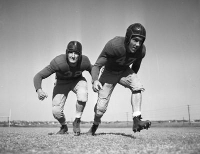 The Texas Wesleyan Rams are preparing for a college football game against Trinity University. Drawing starting berths Saturday, left to right, are Elmer Addington (32) and Darrell "Slick" Mahan (47). They have played steady football all season at the left and right tackle positions. They are shown charging toward the camera dressed in football uniforms and helmets.