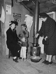 The Fourth Annual Goodfellow Ball will be held on November 29 at the Hotel Texas. The event is being sponsored by the Business and Professional Women's Club. Visiting one of the families in need are Mrs. J. B. Clark (left, seated) and Mrs. Hazel Rounds. They are gathering around the furnace. Mrs. Clark is wearing a hat, coat, and gloves. Mrs. Rounds is wearing a hat, checkered coat, and gloves. Two young boys are standing beside Mrs. Clark.