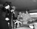 The Fourth Annual Goodfellow Ball will be held on November 29 at the Hotel Texas. The event is being sponsored by the Business and Professional Women's Club. Dr. Catherine Kenney (left) and Miss Sarah Vinson, chairman of the club's publicity committee for the ball, are shown visiting one of the Goodfellow Families in their trailer home. Mrs. Kenney is wearing a hat, dress, and a coat with a fur collar. Mrs. Vinson is dressed in a hat, blouse, skirt, and coat. She is handing a toy to the youngest child. All proceeds from the ball will go to the Goodfellows Fund. The three young children, far right, are sitting on a mattress.