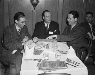 The Southwestern Exhibition and Fat Stock Show is getting a head start on publicity for the 1940 show with a Goodwill Tour. At the Durant, Oklahoma luncheon are left to right David MacDonald Junior, Berl E. Godfrey, and Glenn McDonald. Mr. MacDonald is a Durant, Oklahoma attorney. He is wearing a three piece tweed suit. Mr. Godfrey, is the Kiwanis Club past president. He is dressed in a three piece suit. Mr. McDonald is the manager of the Durant Chamber of Commerce. He is wearing double breasted pinstripe suit.