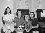 In 1941, new residents of Fort Worth were Mrs. Bertram J. Niver and her children, Nancy, 11, left; Phillip 9, and Patricia, 14. They moved to Fort Worth from Poughkeepsie, N.Y. Mrs. Niver was the honoree at a luncheon given by Mrs. Hubert Holland on Thursday, Nov. 14, 1941. Published in the Ft Worth Star-Telegram, evening edition, Nov. 17, 1941. Woman and three children, two girls and a boy, seated on a fabric sofa in front of a window with roller shades and sheer drapes with pom-pom trim. Woman is holding an open book. The woman and her two daughters are wearing dresses, pearl necklaces and an American flag brooch, and the son a jacket and tie.