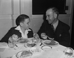Ralph Beaver Senior and his son, Ralph Beaver Junior, are shown dining at a Father and Son Week banquet at the Young Men's Christian Association (YMCA). They are both sitting at a table and are wearing suits. On the table are several cups, plates and utensils. Published Fort Worth Star-Telegram Morning Edition November 15, 1941.
