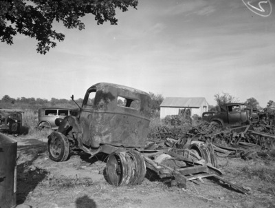 Lumber truck showing effects of the crash between two trucks and a gasoline tank explosion at Scenic Point on the Bankhead Highway, seven miles east of Ranger, Texas. There are other vehicles in the background. Seven died in the crash and more were injured.