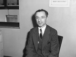Henry Rockwood, of the Weather Bureau, seated and wearing a coat, tie and vest. A poster on the back wall reads, "Keep 'Em Flying!"