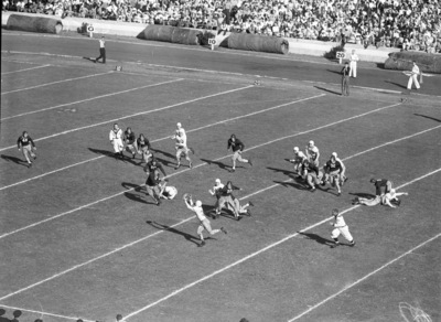 The Texas Christian University Horned Frogs are facing the number two ranked University of Texas Longhorns at Texas Memorial Stadium in Austin, Texas. The Longhorns took an early lead in the game with a first quarter touchdown. The play began with back Jack Crain (44) taking the ball off tackle on the left side. As Frog defender Van Hall (22) swarmed, Crain lateraled to Pete Layden (31). Layden sprinted thirty-six yards for the first touchdown of the game. The T. C. U. defenders in Pursuit are Fred Taylor (32), Woody Adams (70), Billy Blackstone (50), Darrell Palmer (71), Bob McCollum (38), and Charley Conway (12). Blocking for Layden's touchdown was Malcolm Kutner (80). Despite the early Longhorn lead, T. C. U. went on to win 14-7. Published in Fort Worth Star-Telegram, morning edition, November 19, 1941.