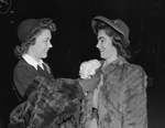 Texas Christian University students and fans are traveling to Austin, Texas to see the Frogs battle the number two ranked University of Texas Longhorns. Preparing to ride on a special seven-car train to Austin are left to right Miss Jeannette Hoffman and Miss Margaret Hopkins. They are both residents of Cleburne, Texas and students at T. C. U. Miss Hoffman is dressed in a hat, collared blouse, blazer, and gloves. With a coat slung over her arm, she is pinning a huge chrysanthemum on her friend. In addition to the mum, Miss Hopkins is wearing a hat, dress, and a fur coat. Published in Fort Worth Star-Telegram, evening edition, November 15, 1941.