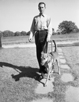 Howard Batis, 25, blind since he was 13 years old and his seeing eye dog, "Flash." Flash, a gray German Shepherd and Batis are on their first "workout" after arriving from Morristown, N.J. This comprised of spending ten days together, until she (Flash) gets used to the new surroundings. The Seeing Eye dog, trained at the Seeing Eye Institute to work with Batis, will make it possible for him to walk without a human guide. The dog is trained to protect her master from traffic hazards, as well as any emergency conditions. Batis spent a month at the institute making friends with Flash and learning to follow her directions. The trip was made possible for Batis by the Fort Worth Lions Club, which financed his trip to and from the institute. Man is seated on a wooden porch in front of a light colored clapboard house with dark windows wearing a striped button-down shirt and dark pants, to his left is his guide dog in a harness. Published in the Ft Worth Star-Telegram morning edition, Nov. 16, 1941.