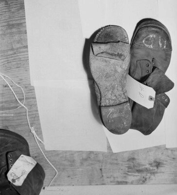 Soldiers shoes after 45 days of use. Left shoe is upside down displaying that the sole is pulled away in the toe region and the heel is very worn. The right shoe is upright and has a tag with writing "11-D" and there are no laces, though the eyelets are visible and the leather is very worn. Published Ft Worth-Telegram morning edition, Nov. 18, 1941.