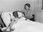 Bryan A. Waggoner, 45 year old employee of the Fort Worth Paper Company, shown in bed, with his wife at his side. He drove a loaded truck to Lubbock after suffering severe hand and face burns in a gasoline tank explosion near Ranger, TX, Saturday night (11/15/1941). The explosion killed seven and injured a score of others. Another driver brought him back to Fort Worth Monday (11/17/1941) and he entered St. Joseph's Hospital. Published in the Fort Worth Star-Telegram morning edition, Nov. 18, 1941. Shirtless man in reclining hospital bed, his bandaged right hand in a container of liquid and a woman (wife) seated beside him wearing a hat, blouse and large necklace.