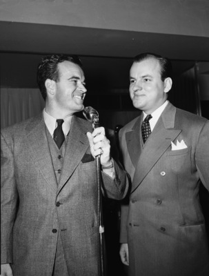 Nick Stuart, left, shown with John Paul Jones, of Houston, Texas, the new singer with Stuart's band, which opened a holiday engagement at the Hotel Texas Den. Mr. Stuart is standing behind a microphone, holding the pole. Both men are wearing suits and are smiling. Mr. Stuart's is a three-piece suit and Mr. Jones's is a double-breasted suit. Mr. Stuart has his head turned towards Mr. Jones, who is looking off to his right.