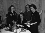 Attendees at the house party held by the Fort Worth Pan-Hellenic Association at the home of Mrs. H. B. Fuqua included, left to right, Mrs. W. P. Capps, Mrs. Landon Feear (seated), Mrs. H. B. Nowlin Junior and Mrs. Thomas B. Romine. The four women are gathered in front of a table on which there is a tray of coffee cups and a coffee pot. Mrs. Feear is pouring a cup of coffee and Mrs. Romine is holding a plate of fruit. All the women are wearing dark dresses.. Behind them are a few windows decorated with floral print curtains.