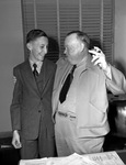 The West Texas Chamber of Commerce (W. T. C. C.) held a "My Home Town" essay contest at their recent convention in Midland, Texas. Pictured left to right are Weldon Huntsman and Mayor I. N. McCrary. Mr. Huntsman is a 15-year-old junior at Winters High School, and the winner of the essay contest. He is dressed in a three-piece suit. Mayor McCrary is welcoming the guest of honor to Fort Worth, Texas, where they will attend the Kiwanis Club luncheon. Mayor McCrary is wearing button-up shirt, necktie, coat, trousers and is smoking a cigar.