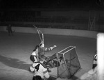 The 1941-1942 American Hockey Association (A. H. A.) season is in full swing at Will Rogers Memorial Coliseum. The Fort Worth Rangers are hosting the visiting Kansas City Americans. Ranger wing, Connie King (9), is shown scoring a goal just passed the American goalie. King is holding his hockey stick in the air as he celebrates. Attempting to defend the shot for Kansas City are Fido Purpur, extreme left, and Red Mitchell (4).