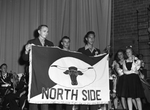 This maroon and white silk flag, prominently displaying North Side High School's steer head. Behind the flag, left to right, Charlton Hudgins, Roe Clayton and Glen Howse. They're seen to be holding a maroon. Published in the Fort Worth Star-Telegram morning edition, November 20, 1941.