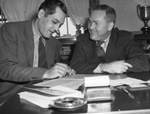 Rogers Hornsby, Manager of the Fort Worth Cats, right, watching Hank Oana sign his contract for the year with the team. The two men are sitting at a desk that is covered with an array of papers and an ashtray. Both men are dressed in dark suits with patterned ties. In the background is a large window decorated with see-through curtains. Also in the background, at right, is a trophy on top of a desk.