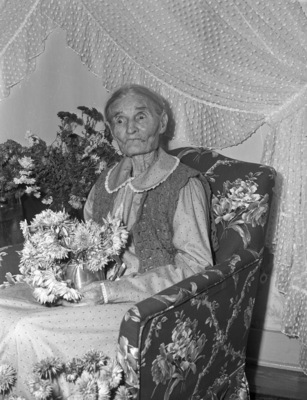 Friends she hadn't seen in more than 40 years were among the 200 who came to pay their respects to Mrs. Naomi Jane Killough of Granbury when a daughter held open house on Mrs. Killough's ninety-third birthday. She is shown sitting in a chair holding a watering can full of cut flowers. Published Fort Worth Star-Telegram Evening Edition November 24, 1941.