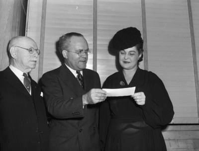 The Lighthouse for the Blind received a check for $970.79 as the proceeds from a benefit world championship blind golfers' match at Rockwood Course. The match was between Marvin Shannon of Fort Worth, Texas and Clinton F. Russell of Duluth, Minnesota. H. C. Burke Junior (center), treasurer of the civic committee which promoted the match, is presenting the check to Mrs. Floyd Sweet, treasurer of the Fort Worth-Tarrant County Association for the Blind while Theodore Mack, association councilor, looks on. Both men are wearing suits and ties. Mrs. Sweet is wearing a dark dress and hat. This photograph was published in the November 24, 1941 evening edition of the Star-Telegram.