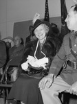 Mrs. Ernest O. Thompson, shown at the retirement ceremony for her husband, Colonel Thompson, commander at Camp Bowie, Brownwood, Texas. She is wearing a dress, a fur coat, a hat and gloves. In her lap is a handbag. Sitting beside her, at right, is an unidentified man wearing a military uniform.