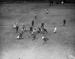 The Texas Christian University Horned Frogs are hosting the visiting Rice University Owls at Amon G. Carter Stadium in Fort Worth, Texas. Nolan Sparks (number 24) was a consistent ground-gainer for the Frogs in the game with Owls Saturday afternoon. He is shown in the first quarter of a hard-fought battle, weaving through Owl defenders for a first down on the Texas Christian University (T. C. U.) forty-seven yard line. Sparks was eventually brought down by Owl halfback J. C. Dickson (number 46). The other Rice defenders in pursuit are Calvin McDougle (number 20), Weldon Humble (number 60), and Bob Brumley (number 30). Tough defensive play and the cold weather resulted in a scoreless tie. Published in The Fort Worth Star-Telegram morning edition, November 23, 1941.