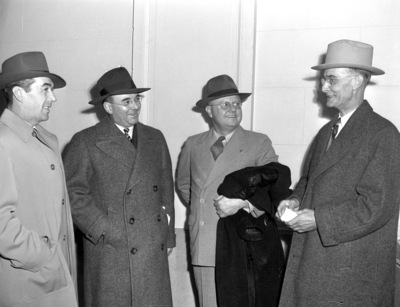The American Legion is holding their meeting at the Hotel Texas in Fort Worth, Texas. Distinguished legion members from Texas and Oklahoma are attending to greet their national commander. In attendance, left to right, are Max Fife, Lynn U. Stambaugh, Andrew Dilworth, and Dr. W. J. Danforth. Mr. Fife, of Blackwell, Oklahoma, is the commander of the Oklahoma department. He is wearing a hat and a trench coat. Mr. Stambaugh, of Fargo, North Dakota, is the national commander. He is wearing a hat, suit, and a coat. Mr. Dilworth, of San Antonio, Texas, is the Texas department commander. He is wearing a hat and a double breasted suit. His coat is slung over his arm. Dr. Danforth, of Fort Worth, Texas, is the national executive committeeman from Texas. He is wearing a cowboy hat, suit, and a coat.