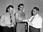 Amateur boxers from all around the area are preparing for the 1942 Golden Gloves District Tournament in Fort Worth, Texas. In the gym, left to right, are Oliver Ball, Nick Anagnostic, and Woody Taylor. Mr. Anagnostic is a light heavyweight Golden Gloves boxer. He is having his hands taped, in preparation for some heavy drilling. Mr. Ball is one of the instructors. He is dressed a button-down shirt, necktie, and trousers. Mr. Taylor, another instructor, is wearing a striped dress shirt, necktie, and trousers.