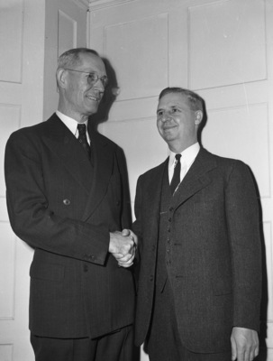 V. L. Beeman, left, Fort Worth manufacturer, greets an old friend, Dr. George S. Benson, president of Harding College, Searcy, Arkansas, who spoke at a Chamber of Commerce luncheon. They are shown standing in business suits and shaking hands. Published Fort Worth Star-Telegram Evening Edition November 24, 1941.