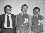 High School football from Fort Worth, Texas are being named to the All-State team. Representing their schools, left to right, are Frank Huffman, Thomas Brady, and Floyd Lewis. Huffman is a 160-pound guard from Polytechnic High School. He is dressed in a herringbone suit. Brady is an end at the Masonic Home High School. He is wearing a dress shirt, necktie, herringbone trousers, and a letterman jacket. Lewis is also representing the Masonic Home High School, where he plays tackle. He is dressed in a collared shirt, necktie, trousers, and a letterman jacket. "(Star-Telegram Photo.)" Published Star-Telegram Morn. Nov. 30, 1941.