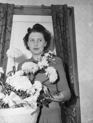 Emma Lillian Hentz, bride elect of Philip Schmucker of Chicago, Illinois. Miss Hentz is shown standing behind a bouquet of flowers sitting on a table. She appears to be looking off to her left as she wearing a long-sleeve dress. Behind her is a window with its curtains open. A soldier dance arranged by the United Service Organization brought the couple together. The first dance of the evening brought the couple face to face and allowed the romance to blossom. They are set to get married in December. Published in the Fort Worth Star-Telegram morning edition, November 26, 1941.