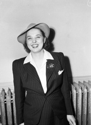 A merry-eyed Fort Worth girl was off on an exciting 4,000 mile journey to Honolulu, where she will marry her childhood sweetheart, a member of the air corps. Miss Marion Hale, 20, quit her department store job this week, kissed her parents and her sister goodbye and left Wednesday night by bus for the West Coast. Her boat sails this weekend. She will wed Leo Nugent, about 22, grandson of a Spur contractor and now a draftsman with the air corps. They both went to grammar school and high school at Spur, graduating together in the class of 1939. The trip by bus and boat will require about 12 days and the wedding will take place soon after her arrival. The couple will make their home in Honolulu. In this picture, Miss Marion Hale is shown standing in front of a wall and a radiator. She is wearing a striped, buttoned jacket and a matching skirt. She is also wearing a brimmed hat. She is smiling widely for the camera. Published in the Fort Worth Star-Telegram evening edition, November 27, 1941.