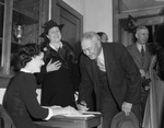 Grapevine honored her weekend farmers with a banquet sponsored by the Lions Club. In this picture is F. A. Gingrich, he registers with Mrs. M. W. Wiley, seated, while Mrs. Gingrich looks on. The trio look gleeful as Mr. Gingrich signs the the registration sheet on Mrs. Wiley's desk. He is wearing a dark suit and holding a hat in his other hand. Mrs. Gingrich is wearing a coat with a fur collar and a hat, while Mrs. Wiley wearing a dark jacket. Behind the scene there are other people waiting being Mr. Gingrich. To the right of the trio there is a wall with a cabinet in it. Inside the cabinet is a trophy. Published in the Fort Worth Star-Telegram evening edition, November 27, 1941.