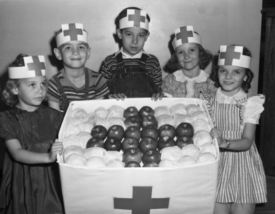 This box of 24 dozen big red apples was sent to the boys and girls of All Church Home on Thanksgiving Day. They were sent by the the Junior Red Cross emblems at Peter Smith School. The apples in the box are also arranged in a way where it looks like the Red Cross emblem. Standing about the box wearing paper hats with the red cross emblem are members of the Junior Red Cross council (left to right) Glenda Peacock, Jimmy Lougheed, Vincent Aguina, Alice Jane King and Anna Lee Smithson. Published in the Fort Worth Star-Telegram evening edition, December 1, 1941.