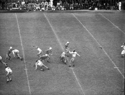 The University of Texas Longhorns and the Texas A&M Aggies are facing off in a rivalry game on Thursday at Kyle Field in College Station, Texas. The Aggies are ranked second by the Associated Press poll and the Longhorns are coming off a tough loss against Texas A&M University. In the third quarter, Wally Scott, Longhorn reserve end, is shown blocking a punt from the Aggie's Derace Moser. Texas recovered the ball on the Aggie thirty-six yard line. The Longhorns went on to win 23-0. Published in The Fort Worth Star-Telegram morning edition November 28, 1941.