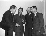 North Texas Agricultural College (N. T. A. C.) is holding a homecoming event on the school campus at Arlington. Four male homecoming participants are pictured here. From left to right, are R. Russo of Houston, Texas; Anson Brundage of Grand Prairie, Texas; C. L. Arnold of Dallas, Texas; and G. M. Dickey of Bowie, Texas. These four ex-students are gathering in the dining hall. They are shown standing and discussing something with one another. Each of them are wearing dark suits and everyone except Brundage is also wearing eyeglasses. Russo appears to be stepping on something and has his knee raised. He is also holding a cigar while Brundage is holding a cigarettes. The group is smiling. Published in the Fort Worth Star-Telegram evening edition, November 28, 1941.