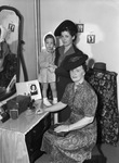 Texas Christian University (TCU) Homecoming celebrants Mrs. Rex Hooper, seated, of Austin, Texas with Mrs. Otto Nielsen and and 2-year old Betty Nielsen. Mrs. Hooper is shown visiting the room she occupied in Jarvis Hall when she was a student. She is seated in front of a vanity that has framed pictures of women, perfumes and a wooden box laid out in front of the large mirror. Mrs. Hooper is wearing a patterned dress and a flat hat tilted towards her face. Mrs. Nielsen stands behind Mrs. Hooper and small Betty stands on the corner of the vanity as her mother holds her. Mrs. Nielsen is wearing a dark coat and a wide collared blouse underneath. She is also wearing a flat hat as well. Her daughter is wearing a small jacket and skirt with a small knitted hat on her head. Behind the trio is a wall with a few more, smaller framed photos hung up and a hat resting on a floral fabric. Published in the Fort Worth Star-Telegram evening edition, November 29, 1941.