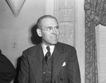 Texas Farm Bureau Federation Convention was held at Hotel Texas. Attendee George W. Stocking who addressed the Texas Farm Bureau Federation Convention is pictured here. Mr. Stocking is shown standing in front of a wall, looking to his left and smiling for the camera. He is dressed in a striped suit and tie and a pair of circular eyeglasses. He is with the Department of Justice. Published in the Fort Worth Star-Telegram morning edition, December 3, 1941.