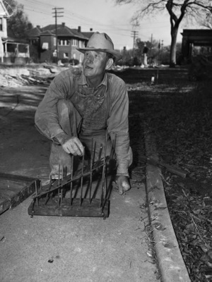 J. W. Suritt, powder foreman, tests dynamite blasts with pin tester to avoid overcharge which might damage nearby homes. Mr. Suritt is shown kneeling down on a sidewalk, wearing overalls, a long-sleeve shirt and a hat. The pin tester is on the ground in front of him and he is holding one of the pins. Behind him is the construction work being done on West Lancaster Avenue.