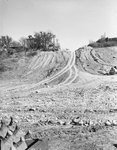Image shows construction work in Fort Worth Texas, on West Lancaster Avenue . The view shows a shot of the construction on west Lancaster avenue with construction in residential area in background. Workers are Cutting through rock at top of West Lancaster Avenue bluff for the cut and fill project to connect Trinity Bridge with Summit Avenue. Published in the Fort Worth Star-Telegram evening edition December 4, 1941.