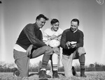 The Amon Carter Riverside High School football team is preparing for the upcoming Bi-District game against the undefeated Sunset Bison. Meeting to adjust the final game plan, left to right, are Assistant Coach Judy Truelson, Martin Jarrell and Coach W. C. O. Harris. Jarrell is the triple threat quarterback. He will carry a majority of the offensive load against the Bison. The coaches are wearing jackets and football pants. Jarrell is dressed in his football uniform. "(Star-Telegram Photo.)" Published Star-Telegram Eve. Dec. 5, 1941.