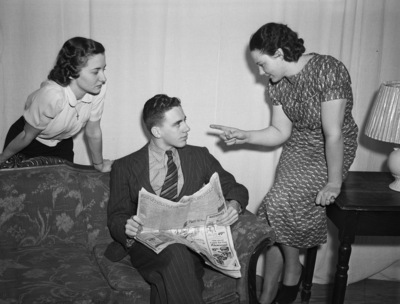 Boulevard Methodist Church play cast (left to right) Jane Turnbow, J. D. Buckman Junior and Blanche Wharton. They are seen acting a scene, Buckman is seen sitting on the couch reading a newspaper, while Turnbow and Wharton are on each opposite side of him leaning in.