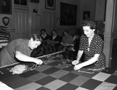 Mrs. George Kreyenbuhl (left) and Mrs. Clyde Webb are tacking a quilt for Saint Teresa's Home.