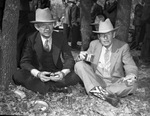 The Quincy Corbett Ranch, located near Breckenridge, Texas, is hosting their annual Field Day. The biggest draw to the event is the legendary barbecue. Sitting cross-legged under a tree and enjoying the barbecue, left to right, are H. D. Criswell and E. G. Williamson. They are both Graham, Texas, ranchers. Mr. Criswell is wearing a cowboy hat, three-piece suit and cowboy boots. Mr. Williamson is dressed in a cowboy hat, suit, and cowboy boots. He is drinking from a tin cup and smoking a cigarette.