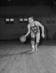 The Texas Wesleyan College (T. W. C.) basketball team is looking to repeat the strong 1940 season. Having a good season will hinge on a new group of starters, including Roy Barber, who will help bring the ball up the court for the Rams. The speedy sophomore is the smallest on the squad, standing five-feet-seven-inches. He is shown dribbling the ball in the gymnasium. He is dressed in a number 33 basketball uniform.